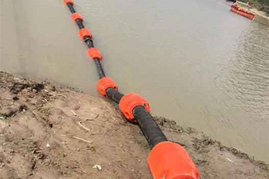 帶浮筒的臥式潛水泵安裝也比較方便,首先在地面把泵和管路連接好,把潛水電纜接頭接好,然后用吊車吊到理想位置即可。管路建議采用橡膠骨架軟管連接。如果管路深入水中比較遠的話,可以在管路上面加裝管路浮筒。