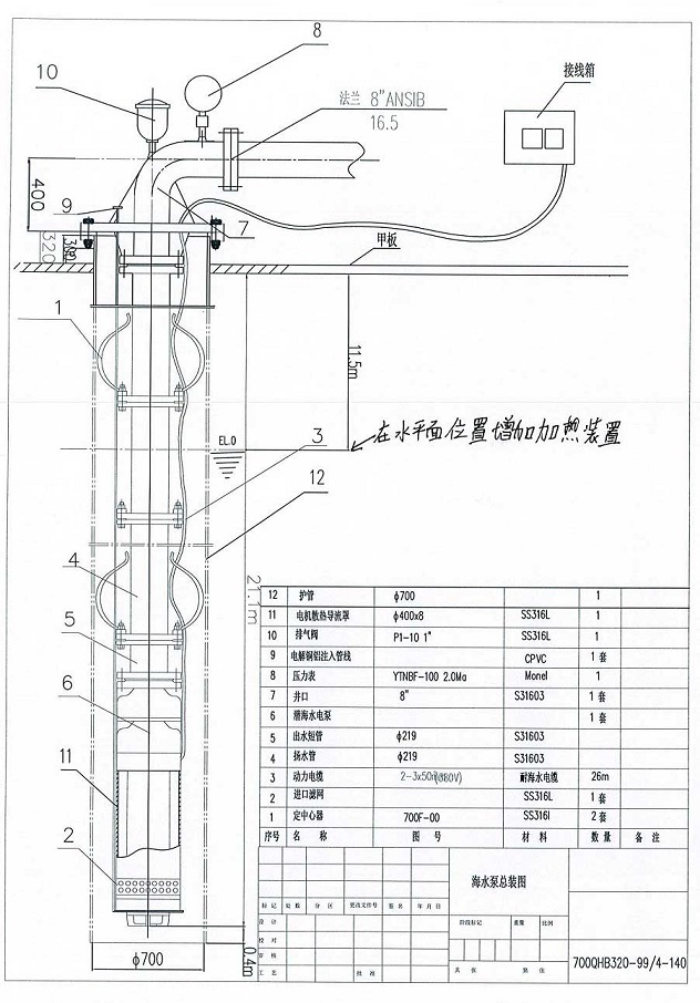 由于現(xiàn)場沒有吊裝平臺,安裝方式受限,少部分采用臥式安裝或者浮筒式安裝。兩種方式均需要把水泵做成臥式,配以臥式支架或浮筒沉與底部或漂浮在海面上。